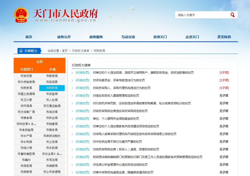2017年,我局按照市政府办统一部署将最新的行政权力事项、权力运行流程图等梳理汇总后,在市政府门户网站专栏进行了公开,成为本部门依法行政、接受社会监督的重要依据。市财政局对所属行政权力进行了认真清理,共清理甄别行政权力事项47项。其中:行政许可信息2条,行政处罚信息38条,行政征收信息1条,行政检查信息1条,行政确认信息1条,行政裁决信息1条,行政备案信息1条,行政检查信息1条,行政服务信息2条。