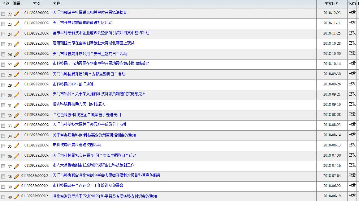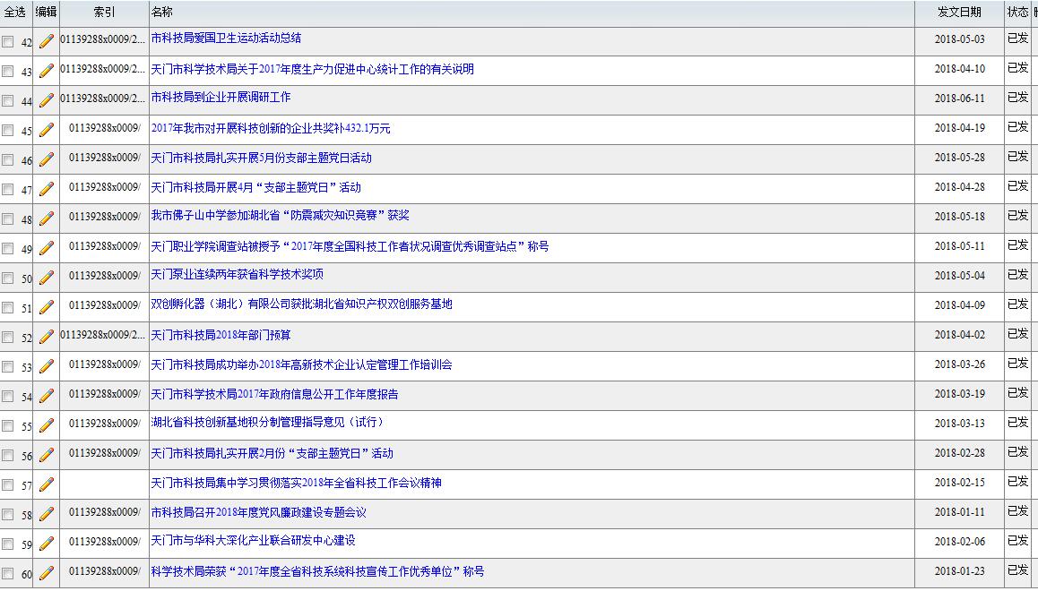按照市政务电子政务办的总体工作部署,结合《天门市科技局2018年度政务公开工作要点》的任务分工要求,我局通过各种公开主体发布信息43条,其中领导职能分工1篇,信息公开指南1篇,信息公开年报1篇,政务动态37篇,财政信息3篇。