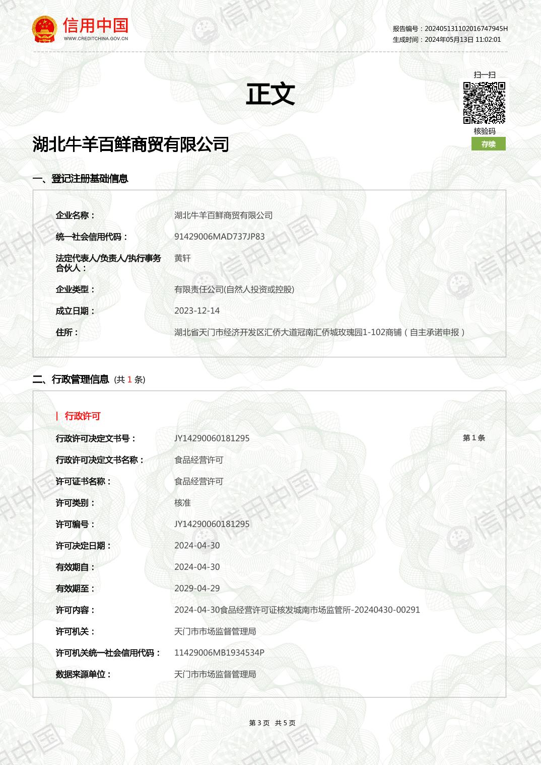 湖北牛羊百鲜商贸有限公司生产经营许可