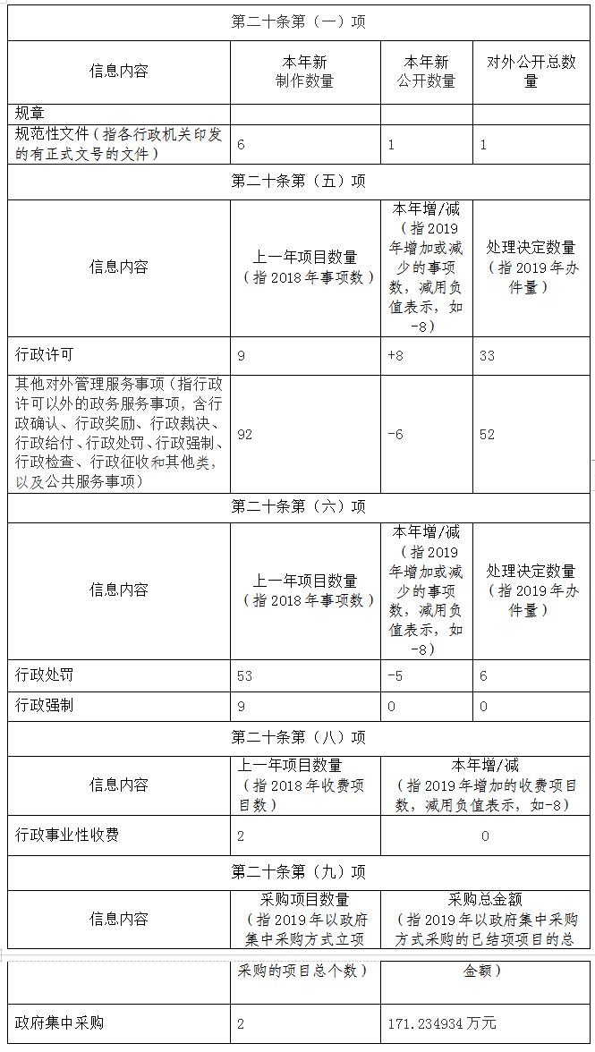 根据《中华人民共和国政府信息公开条例》(以下简称《条例》),现公布市水利和湖泊局2019年政府信息公开工作年度报告。本报告由2019年主要工作情况,政府信息主动公开情况,依申请公开政府信息情况,申请行政复议、提起行政诉讼和申诉情况,存在的主要问题和改进措施,其他需要报告的事项等六部分组成。本年报中所列数据的统计期限自2019年1月1日至2019年12月31日。