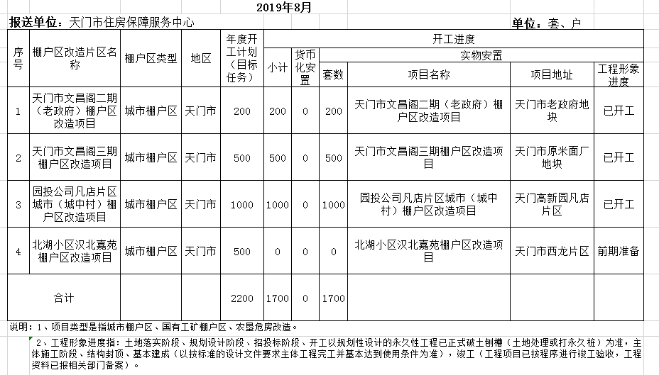 天门市2019年棚户区改造项目进度(8月)